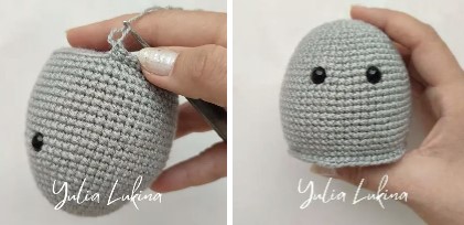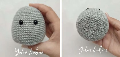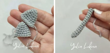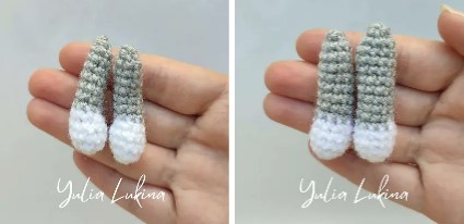 Cousez les oreilles sur la tête entre R 6 et R 11. Découpez deux triangles dans un foamiran blanc et collez-les sur les oreilles.