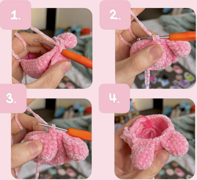 Tour 8 – Pliez l’oreille en deux pour fermer le trou et faire 3 ms pour fermer l’oreille (3)