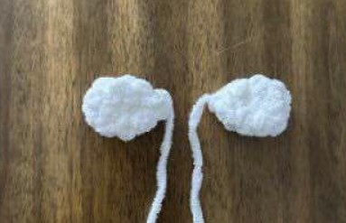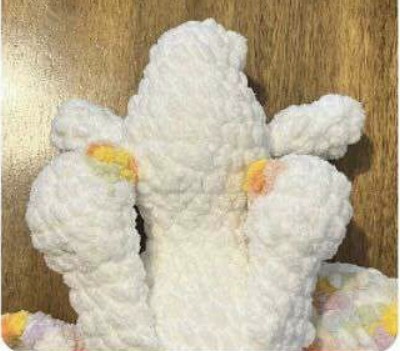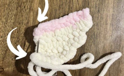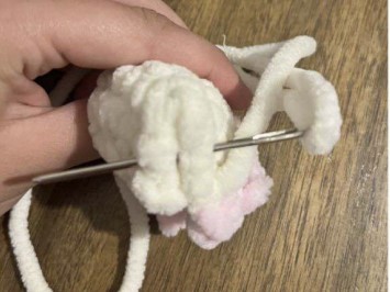 Tour 8. 4 ms, attacher une oreille en passant le crochet à travers le bas de l’oreille, puis dans le corps, et terminer la ms. Continuer normalement avec 2 ms, Bob, 3 ms, Bob, 2 ms, attacher l’autre oreille de la même manière, continuer avec 10 ms (26)