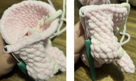 Tour 19. 2 ms, attacher une aile en passant le crochet à travers l’aile et la maille suivante pour former une ms, continuer normalement avec 4 ms, Bob, 4 ms, attacher l’autre aile de la même manière, continuer normalement avec 15 ms (28)