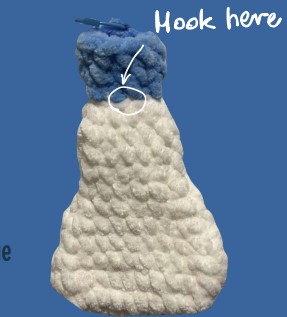 Pour crocheter les détails bleus, tournez la queue sur le côté et insérez votre crochet dans l’espace marqué comme indiqué sur l’image. Tirez une boucle, puis crochetez les détails bleus sur les parties blanches de la queue en suivant les instructions ci-dessous: