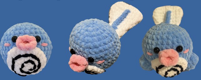 Amis, aujourd’hui je vais vous présenter un modèle d’amigurumi pokémon au crochet avec de très jolies couleurs. Je dois avouer que j’ai particulièrement aimé les tons bleu et rose. Le jouet avec une très grande queue a des joues roses et une bouche rose. On voit que le jouet avec un design de ventre rayé a un ventre blanc et des rayures noires. Des yeux de sécurité noirs sont utilisés sur les bords des yeux du jouet, du fil blanc est utilisé.