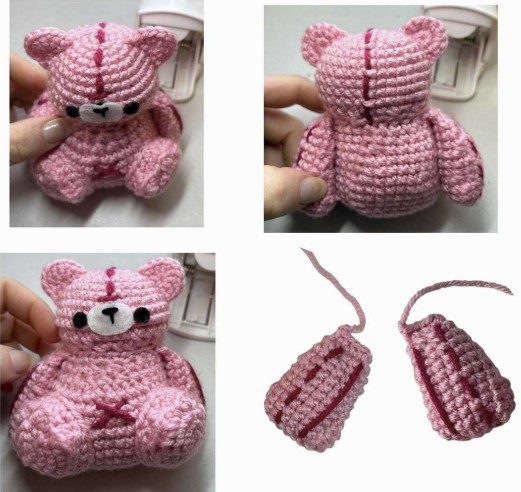 Jambes: coudre les jambes de sorte que le bas des jambes soit entre les tours 6-7 du corps et que le haut des jambes soit entre les tours 11-12 et à environ 7-10 cm de distance.