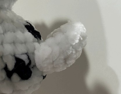 coudre les oreilles entre les tours 3 et 7, en alignant les bords intérieurs avec les yeux.