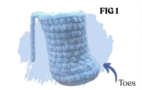 Tour 15 : Marquer la dernière maille que vous avez faite avec un marqueur de maille. Si nécessaire, ms autour de la jambe jusqu’à ce que vous soyez sur le côté de la jambe où vous voudriez que l’intérieur de la cuisse soit (souvenez-vous du nombre de ms ajoutées ici). Ml 2 et joindre à l’autre jambe en utilisant une ms, là où l’intérieur de la cuisse devrait être. Utiliser les mailles marquées du T4 pour aider à orienter les pieds dans la bonne direction. Elles indiquent l’avant du modèle. Continuer autour de cette jambe, en faisant un total (y compris la ms de jonction) de 24ms. 2ms à travers la ml. 24ms – ou jusqu’à la fin du tour si vous avez dû ajouter quelques ms pour arriver au centre de l’intérieur de la cuisse. (52 mailles) FIG 2
