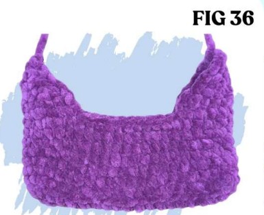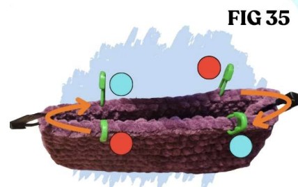 Plier la pièce en deux et trouver la maille du centre-côté de chaque côté. Puis, compter 5 mailles dans chaque direction à partir de chaque maille centre-côté et les marquer, comme montré dans la FIG 35. Chaque côté doit avoir 11 mailles prêtes à être travaillées.