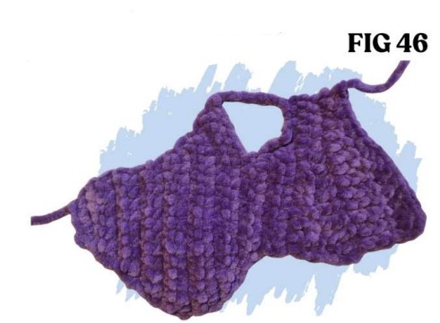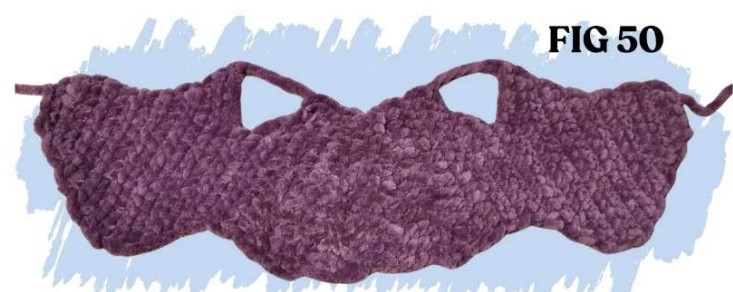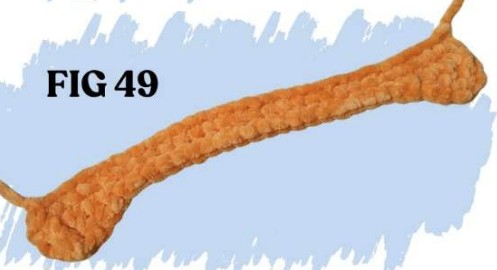 FIG 43 – Enrouler la corde autour de la base du chapeau, de manière à ce que chaque extrémité se rencontre à l’arrière du chapeau. Coudre les deux extrémités ensemble et rentrer les fils.