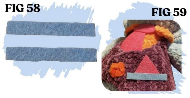 En utilisant du feutre bleu, découper 2 rectangles qui s’adaptent au devant du gilet et qui soient un peu plus longs que le triangle.