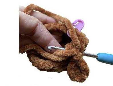 Tour 7 : 2 dim, joindre l’oreille avec 2 ms, 1 dim, (1 ms, 1 dim) répéter 2 fois, joindre l’oreille avec 2 ms, 1 dim, 1 ms, 1 dim, 2 ms [16]