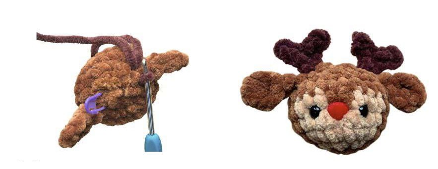 Nous allons d’abord crocheter les oreilles du jouet, et cette étape ne comporte qu’un seul tour, mais elle nécessite l’utilisation de techniques de crochet comme le dB et le br. Ensuite, nous crocheterons la tête du jouet, et vous devrez effectuer des changements de couleur. Cette étape peut être ennuyeuse surtout pour les grands jouets avec beaucoup de mailles, mais ici, la tête se termine après seulement 8 tours de crochet. À la dernière étape, nous crocheterons les bois du jouet. Si vous souhaitez consulter d’autres modèles de rennes, vous pouvez cliquer ici pour voir les autres modèles de renne amigurumi.