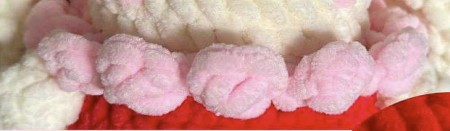 Coudre le chapeau pomme entre les T22 et T23 (juste au-dessus des oreilles), en le fixant environ toutes les deux mailles pour qu’il tienne bien et ne fasse pas de plis.