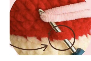 Dans n’importe quelle maille du T1 du chapeau pomme : tirer une boucle, ml 3, à partir de la 2. ml depuis le crochet : ms, mc, puis mc dans la même maille du T1.
