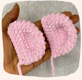 Coudre les oreilles, une de chaque côté, entre les tours 7 et 14 de la tête, à 5 mailles des yeux.