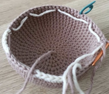 Tour 17 : ms 4, augm, ms 12, augm en marron, ms 7, augm en crème, ms 5 en marron, ms 7, augm en crème, ms 12, augm, ms 8 en marron [65]