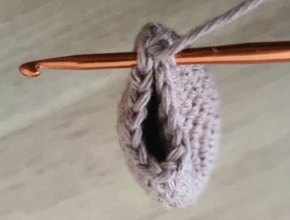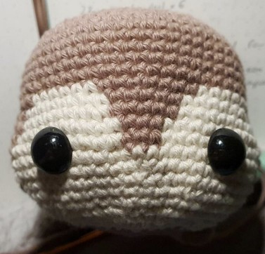 Tour 19 : ms 14, augm, ms 4 en marron, augm, ms 10 en crème, ms 3 en marron, ms 10, augm en crème, ms 4, augm, ms 15, augm en marron [70]