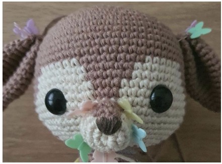 Cousez le museau au milieu du visage entre les yeux, entre les tours 19 et 26 de la tête.