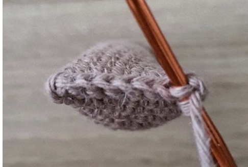 Tour 22 : dim, ms 11, dim, ms 3 en marron, (dim, ms 11) répéter 2 fois, ms en crème, dim, ms 11 en marron. Laissez les 7 dernières mailles du tour 22 non travaillées. [60]