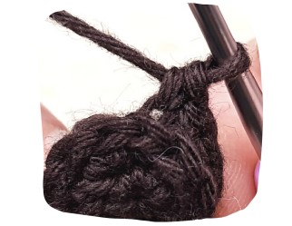 F.o., fermez le trou – avec l’aiguille à tapisserie, enfilez le fil dans les boucles avant du dernier tour et tirez bien, tissez l’extrémité