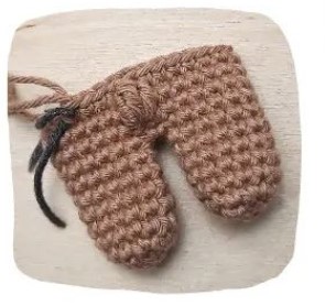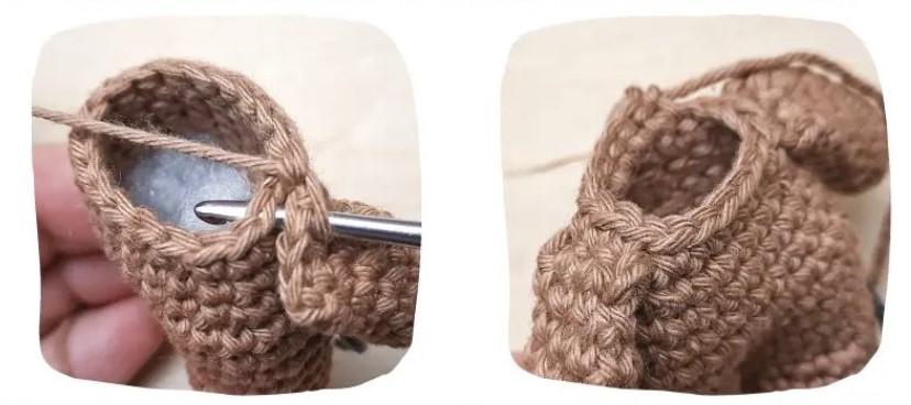 coudre les oreilles à la tête entre les tours 4 et 7, sur les côtés opposés de la tête alignés avec les bras, le côté droit des oreilles doit être tourné vers l’avant.