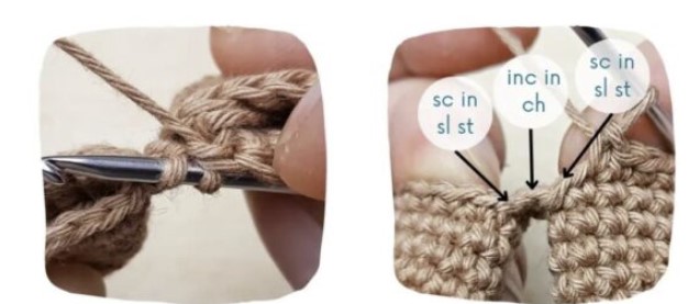 R8. 5 ms, 1 mc, 1 ml, faire la m suivante dans la m juste après la dernière ms faite de la première jambe, 1 mc, 11 ms, augmenter d’un côté de la chaîne, 6 ms [27]