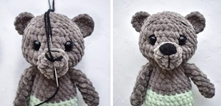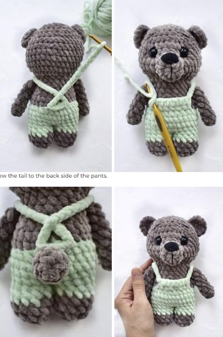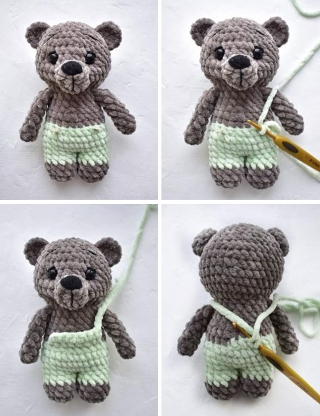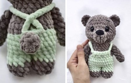 On voit que l’ours en peluche amigurumi avec une combinaison suspendue est réalisé avec un fil très joli et lumineux. Par conséquent, si vous utilisez un fil adapté aux matériaux indiqués dans la description, le jouet que vous fabriquerez ressemblera à l’image. Si vous le souhaitez, vous pouvez omettre le cœur que le jouet tient sur ses genoux.