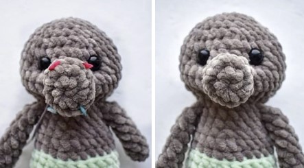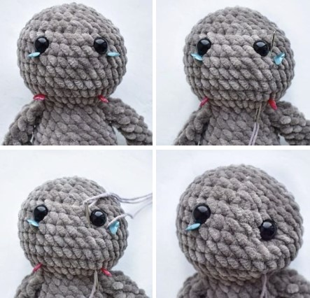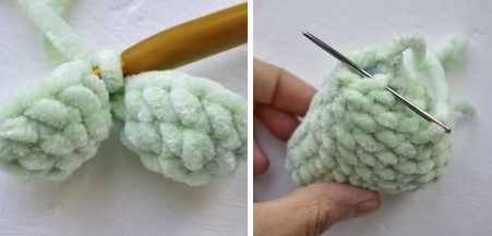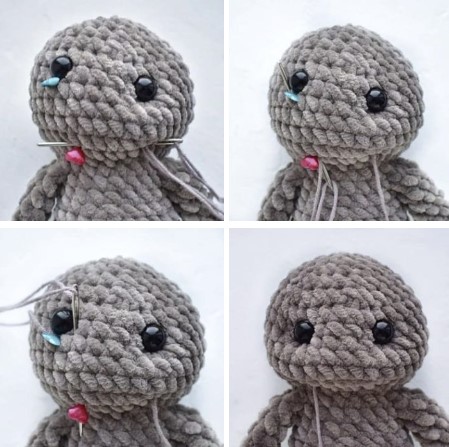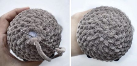 Épinglez les oreilles sur la tête à gauche et à droite, à 3 rangs de mailles du centre de la tête. Cousez les oreilles sur la tête.