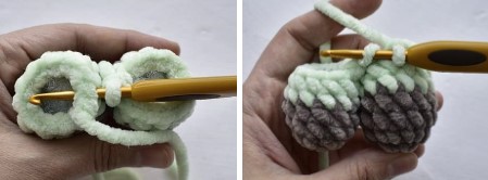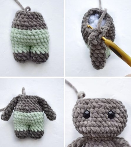 Faire 2 ms supplémentaires sur la deuxième jambe et 2 ml, joindre avec la première jambe.