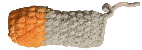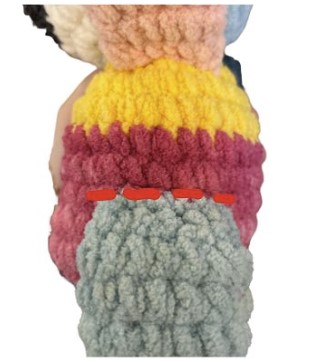 Les jambes du jouet sont un peu plus courtes que les bras, et nous devons les crocheter sur 14 tours. Cependant, comme vous pouvez le voir sur les photos, les jambes ont une structure plus épaisse. Il y a un changement de couleur visible sur la photo, mais c’est à vous de décider si vous voulez l’inclure ou non. Si vous souhaitez faire un jouet multicolore, vous pouvez suivre le modèle avec les transitions de couleurs.