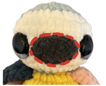 1. Cousez le museau sur l’avant du visage, entre les yeux, entre les tours 7 et 10.