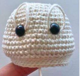 Il suffira de faire uniquement la tête et les oreilles du petit lapin amigurumi. Il n’y a d’ailleurs pas d’autres détails concernant le lapin dans le modèle, mais comme le modèle amigurumi est très détaillé, le temps de réalisation du jouet sera considérablement réduit. Jetons un coup d’œil au petit lapin réalisé avec un crochet de 2,2 mm et des yeux de sécurité de 9 mm.